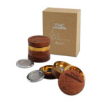Il grinder in 4 parti di “Black Leaf” è realizzato in legno pregiato all’esterno che crea una piacevole sensazione quando si gira avanti e indietro. L’interno è in alluminio anodizzato, compresi i robusti denti diamantati. Un anello scorrevole in nylon previene l’abrasione e lo rende facile da girare. Lo schermo antipolline può essere rimosso rapidamente grazie a una filettatura per facilitare lo svuotamento e la pulizia. È incluso uno schermo a maglie fini e uno a maglie larghe. La preziosa polvere di polline può essere raschiata bene dalla camera inferiore arrotondata con la spatola inclusa.